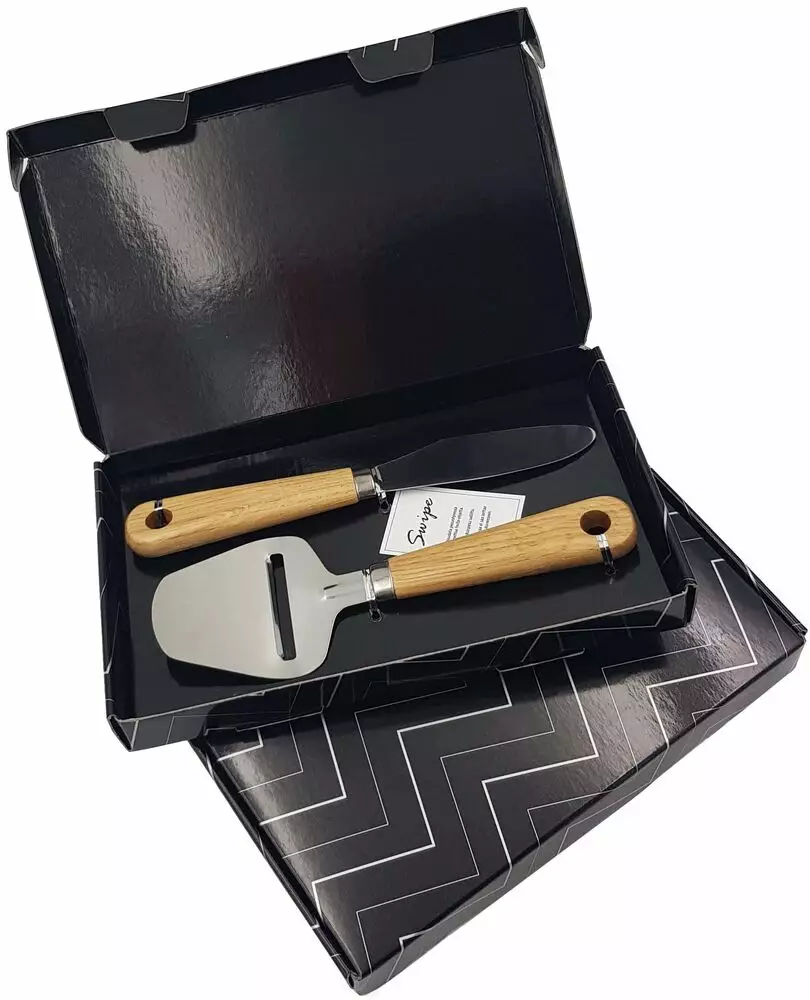 Juustohöylä ja voiveitsi puukahvoilla pakattuna kauniiseen lahjalaatikkoon. Tämä lahja sopii jokaisen kotiin ja työpaikkaan. Postitettava! Materiaaliltaan kestävä ruostumaton teräs, kädensija tammea. Merkkausmahdollisuus laseroituna kädensijaan. Ei suositella konepesua.
