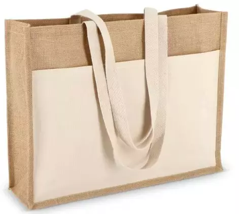 Tukeva juuttikassi, jossa on puuvillainen etutasku ja yhteensopivat puuvillakahvat.