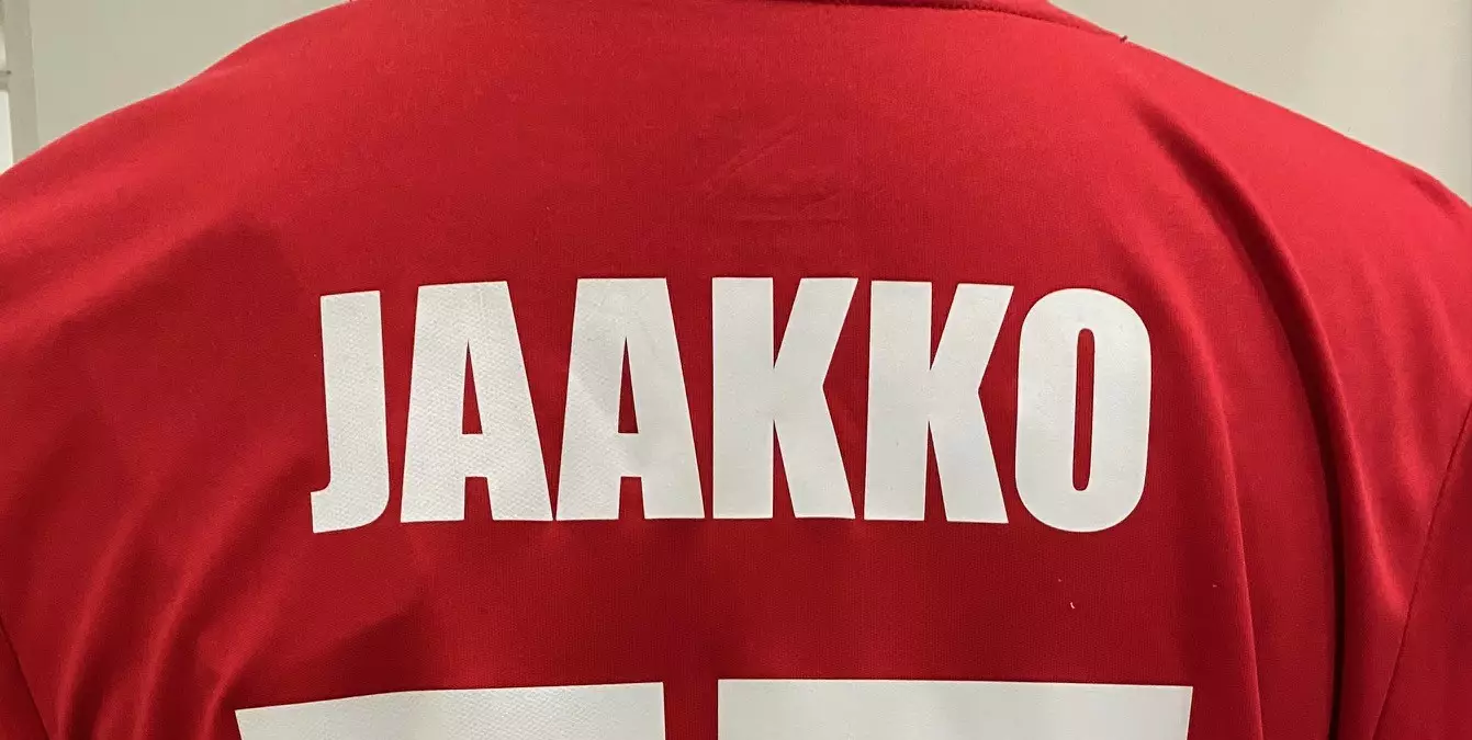 Lämpöprässi pelaajan Nimi selkään IMPACT-fontilla 50mm korkeana Nimipainatus pelipaitoihin