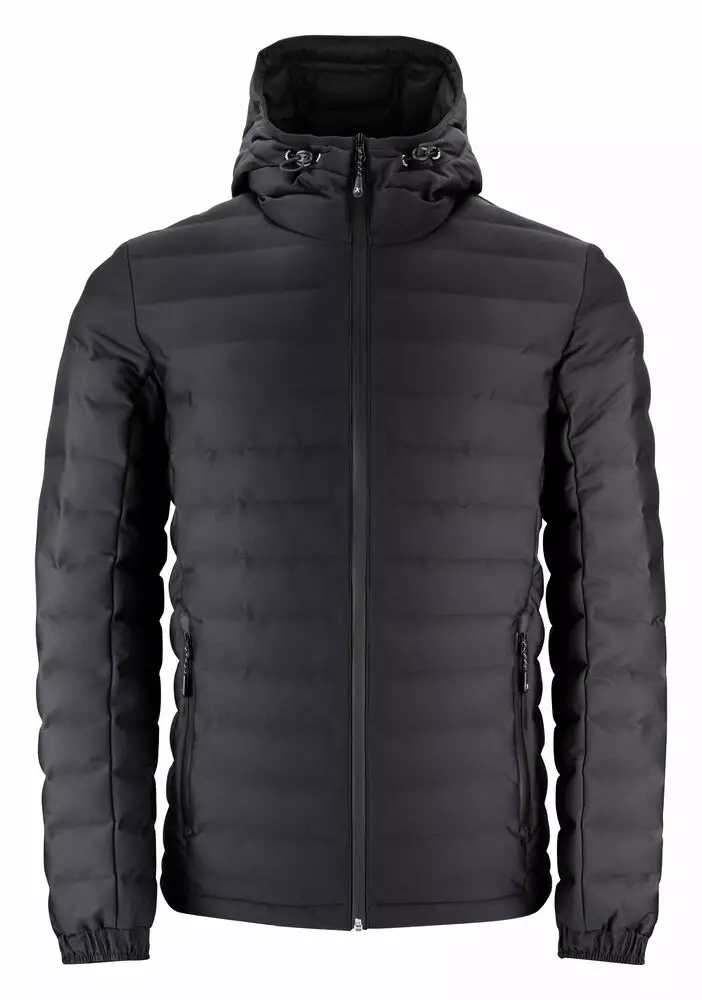 Hihansuut säädettävissä painonapilla. Säädettävä ja kiinteä huppu. Hyvin istuva takki tuntuu miellyttävältä päällä ja siinä on mukava liikkua.